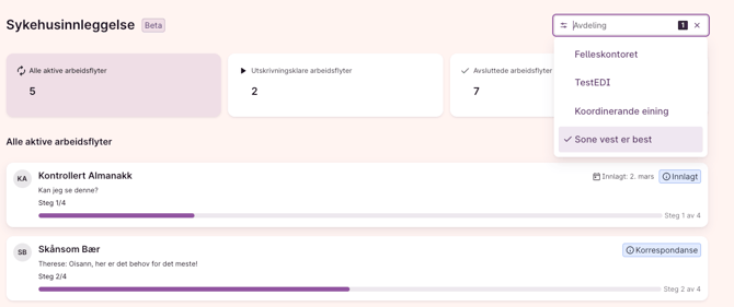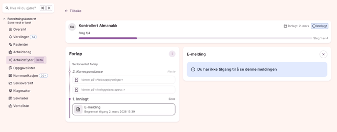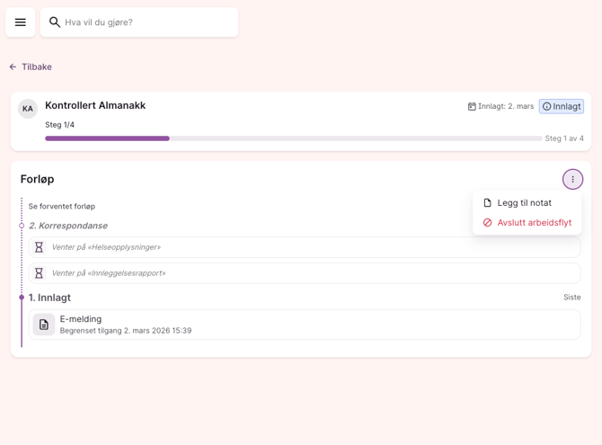 Du kan se arbeidsflyter for pasienter du har tilgang til. Tilgangen følger de samme reglene som for e-meldinger i kommunen din. Kun pasienter du har korrespondansetilgang til, vil vises i listen.
