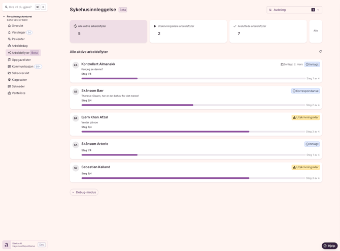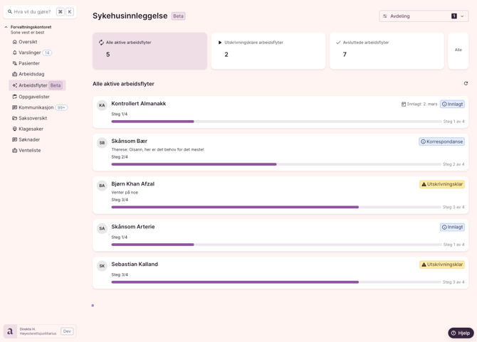 Gå til Arbeidsflyter i venstremenyen. Her ser du en liste over aktive og nylig avsluttede sykehusinnleggelser for pasienter i dine avdelinger.