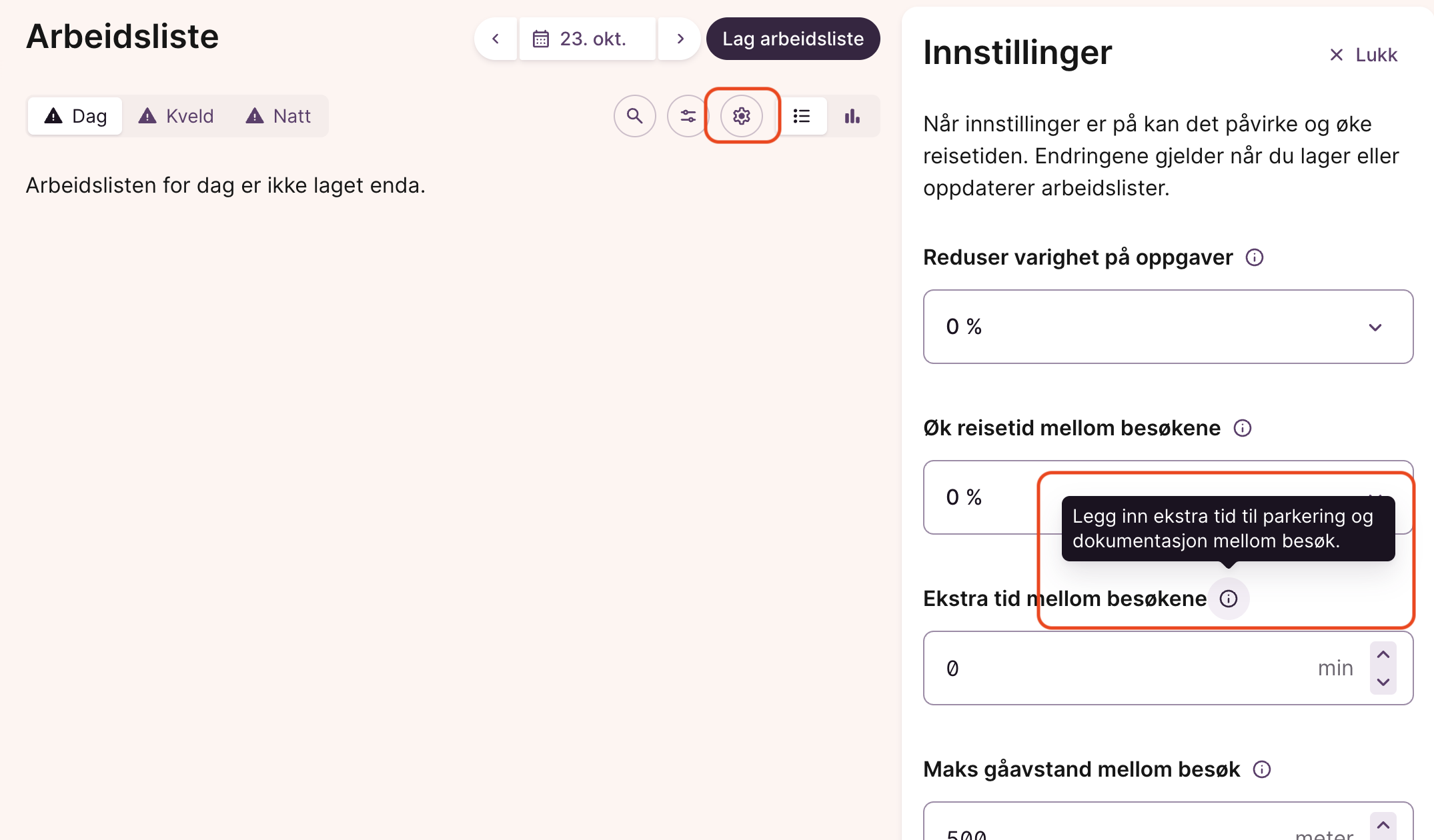- I arbeidslister, klikk på tannhjul-ikonet for å endre standardinnstillinger for ruteplanleggeren.