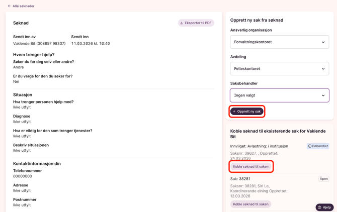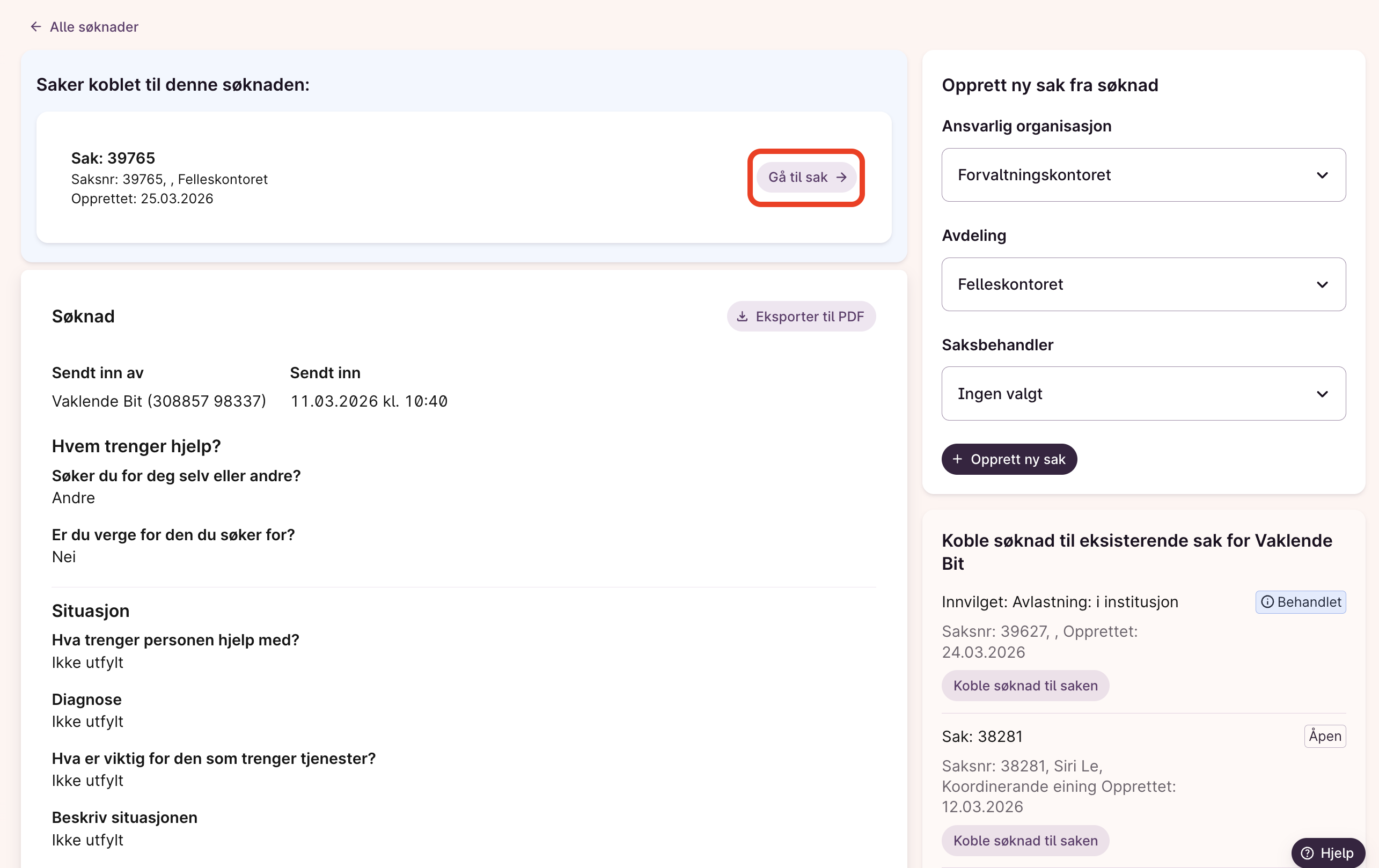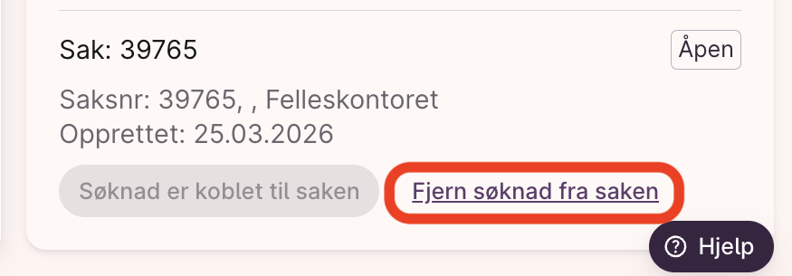 Hvis du har koblet søknaden til feil sak, kan du fjerne koblingen ved å klikke på Fjern søknad fra saken.