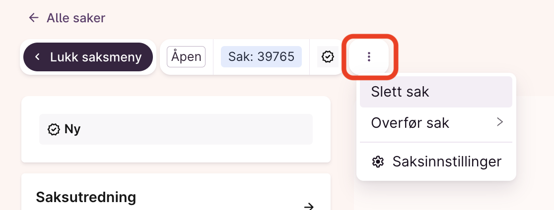 Hvis du har opprettet en ny sak og vil slette den, gjør du det inne på saken. Klikk på Slett sak i menyen med tre prikker.