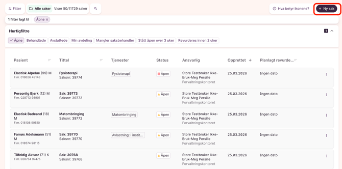 - Klikk på Ny sak under alle saker, og søk opp pasienten der