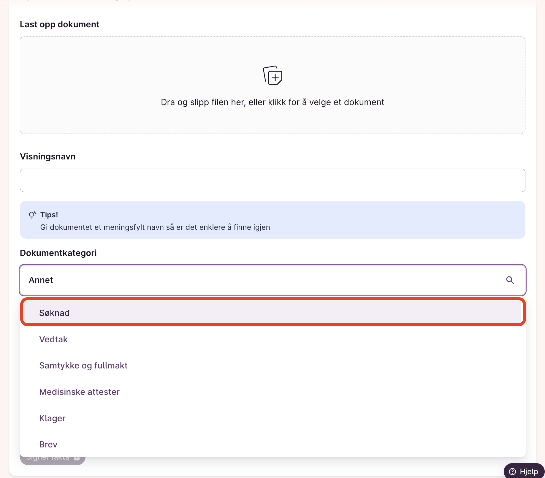 Når du legger til en skriftlig eller muntlig søknad, er det viktig at du velger søknad som type. Da blir det enklere å finne igjen dokumentasjonen senere.