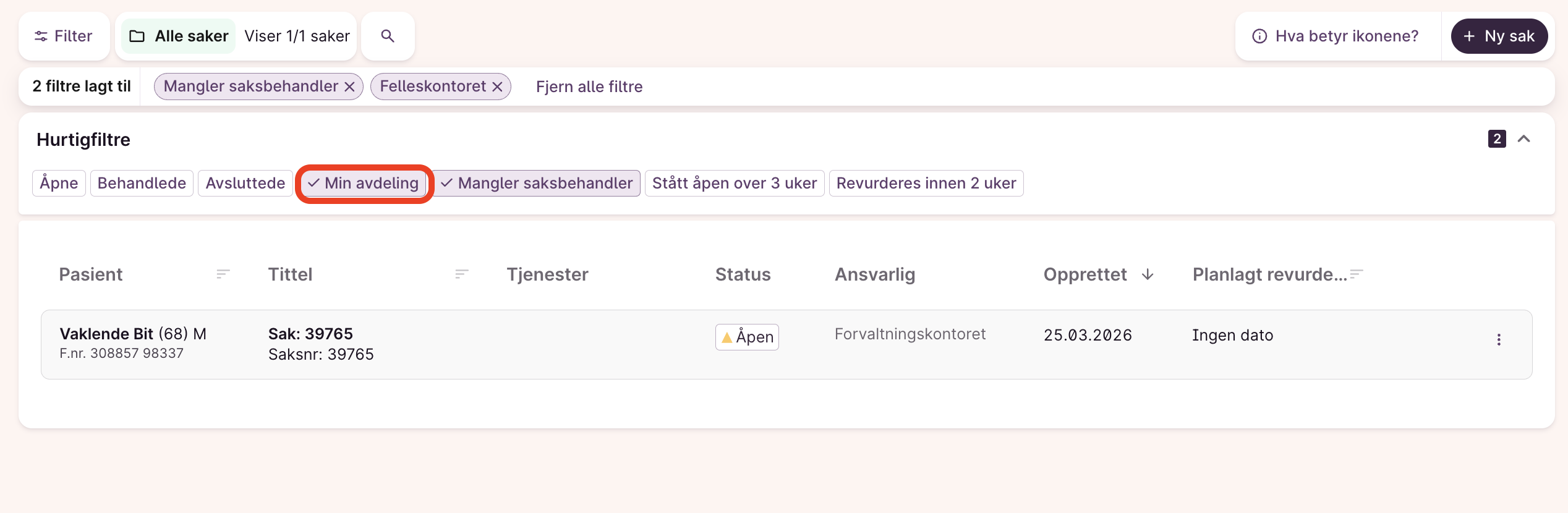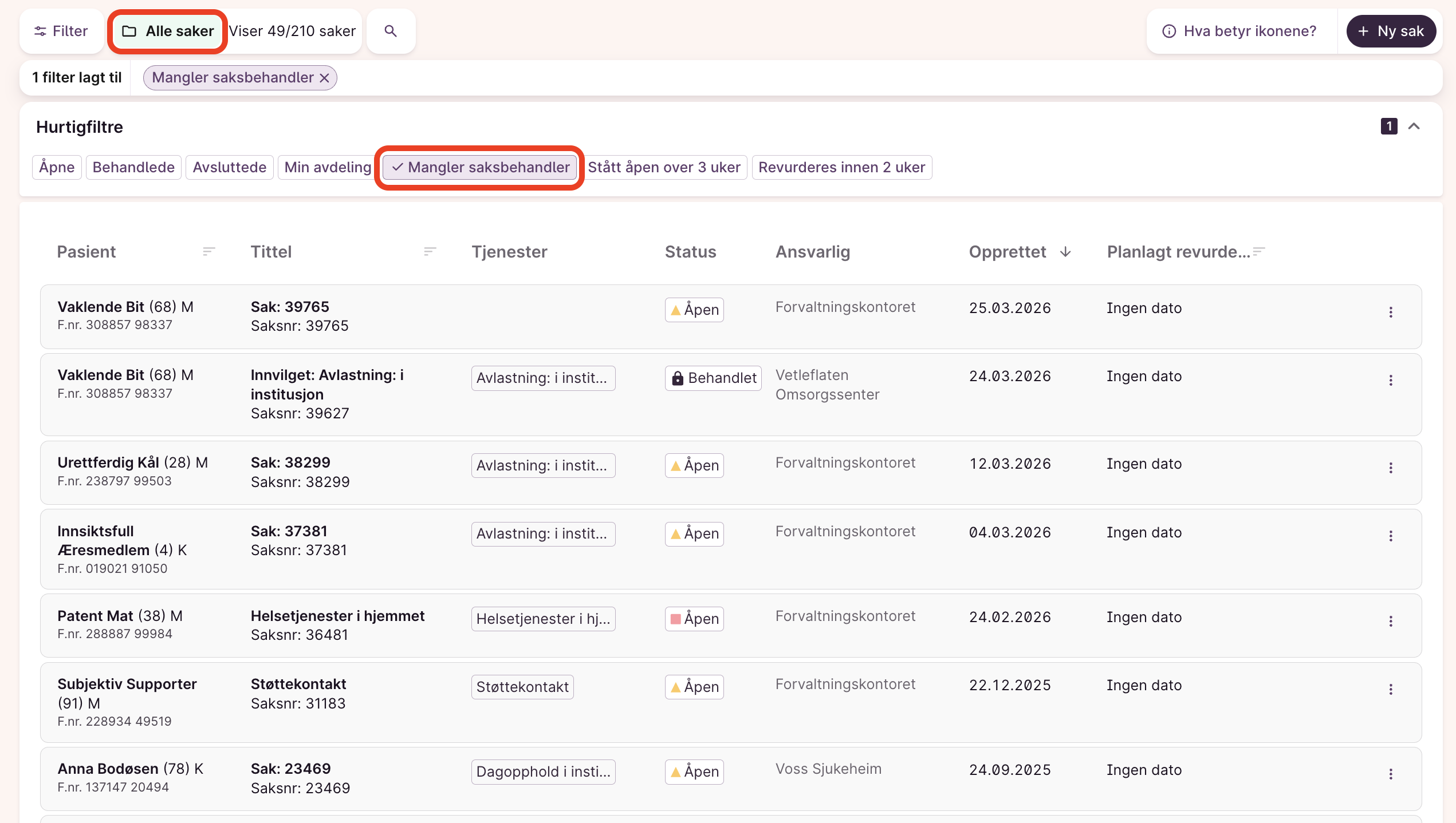 - Gå til Alle saker og velg hurtigfilteret Mangler saksbehandler. Da ser du alle saker uten saksbehandler.