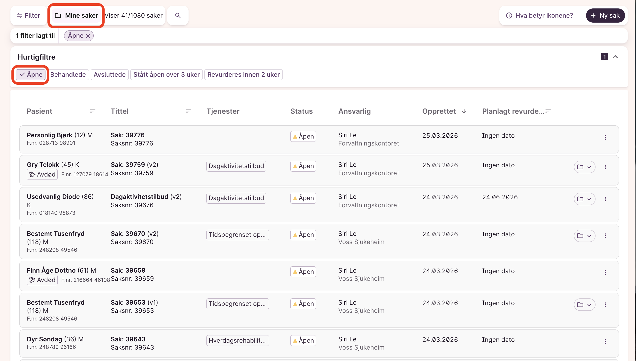 - Vil du se saker som er tildelt deg, finner du dem under Mine saker som Åpne saker.