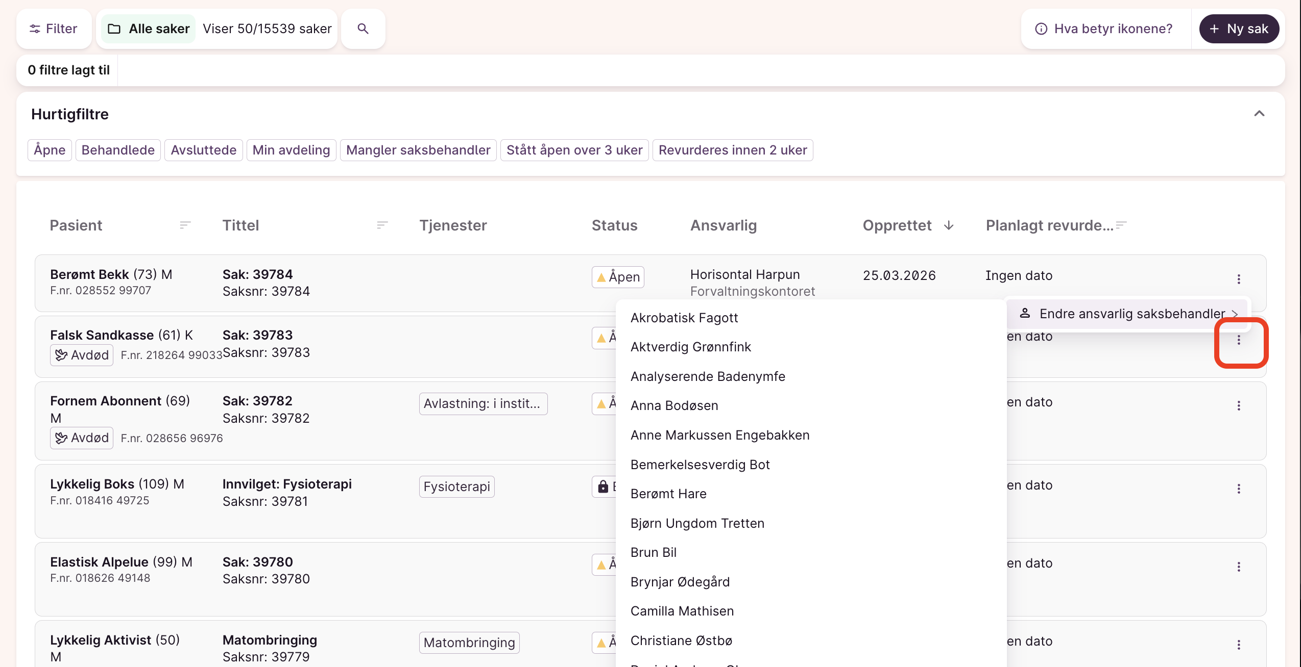 - fra saksoversikten: klikk på menyen med tre prikker til høyre på saken, og velg Endre ansvarlig saksbehandler.