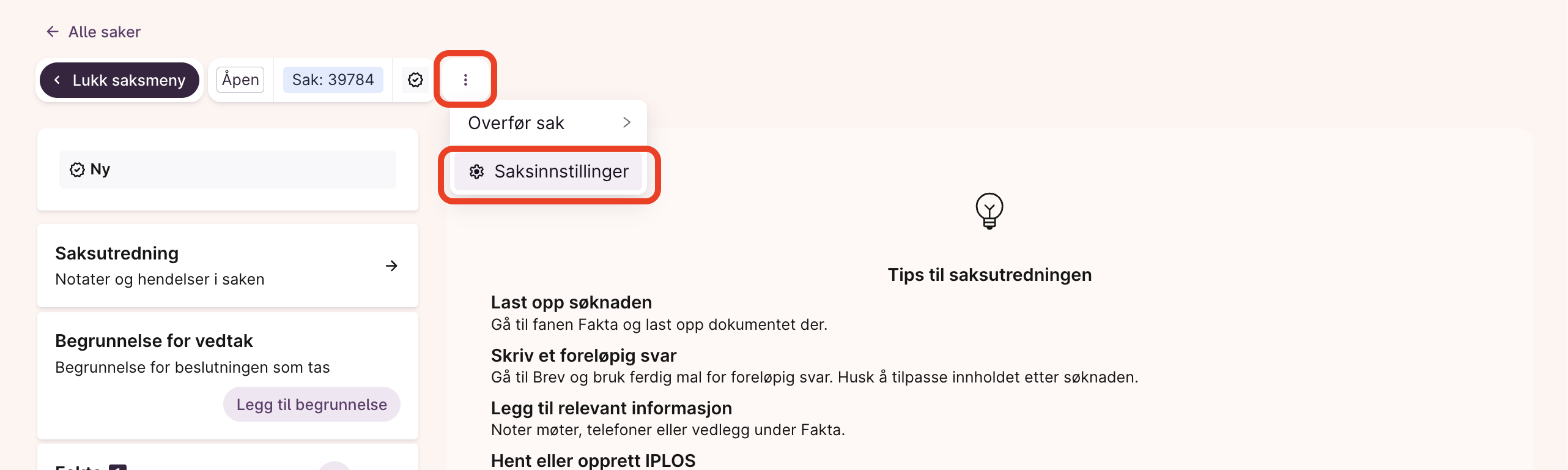- Gå til saken og klikk på menyen med tre prikker øverst. Velg Saksinnstillinger.