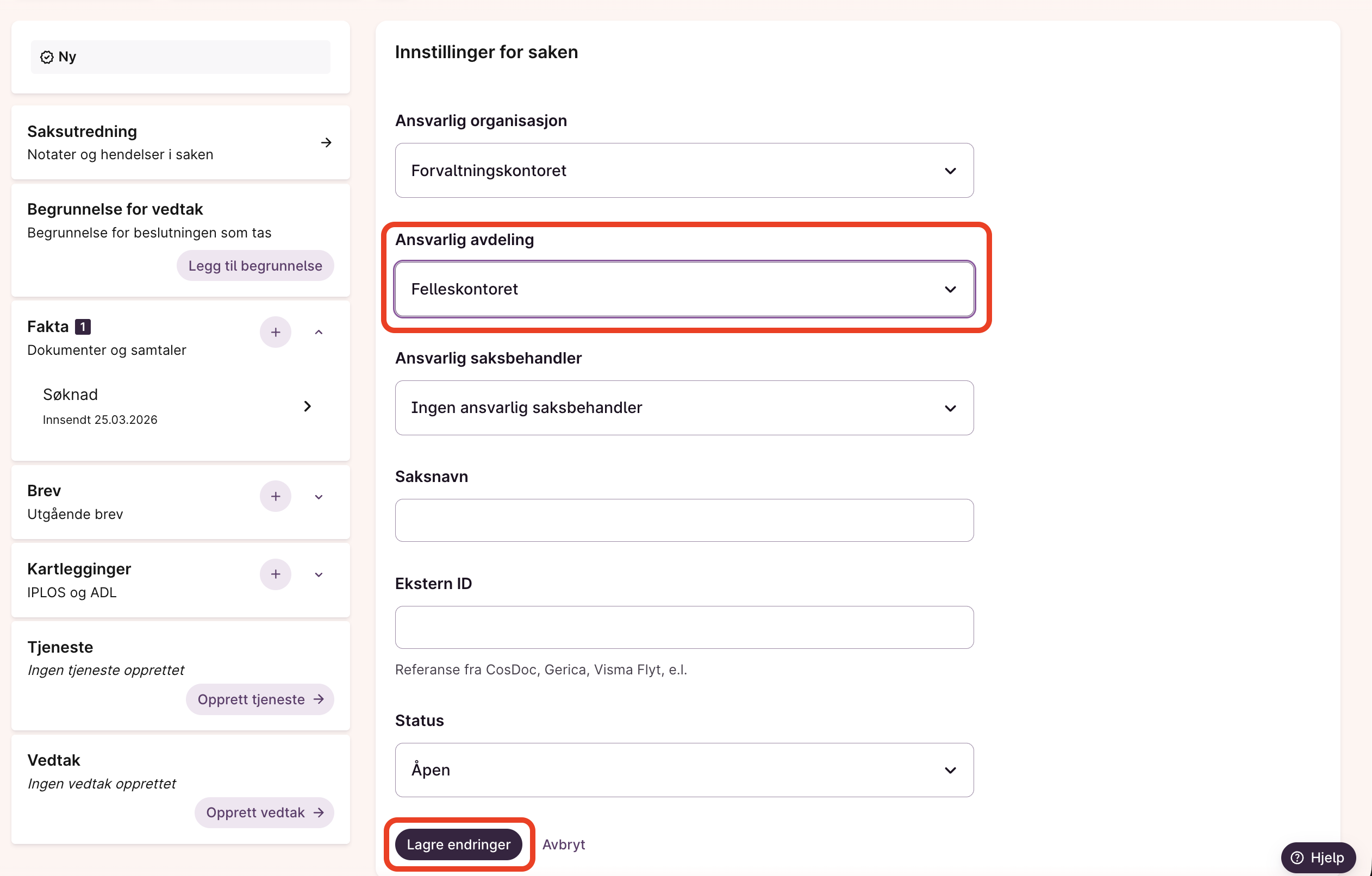 Er du usikker på hvem som skal behandle saken, kan du sette ingen valgt i feltet for saksbehandler. Da kan avdelingen eller organisasjonen fordele saken senere.