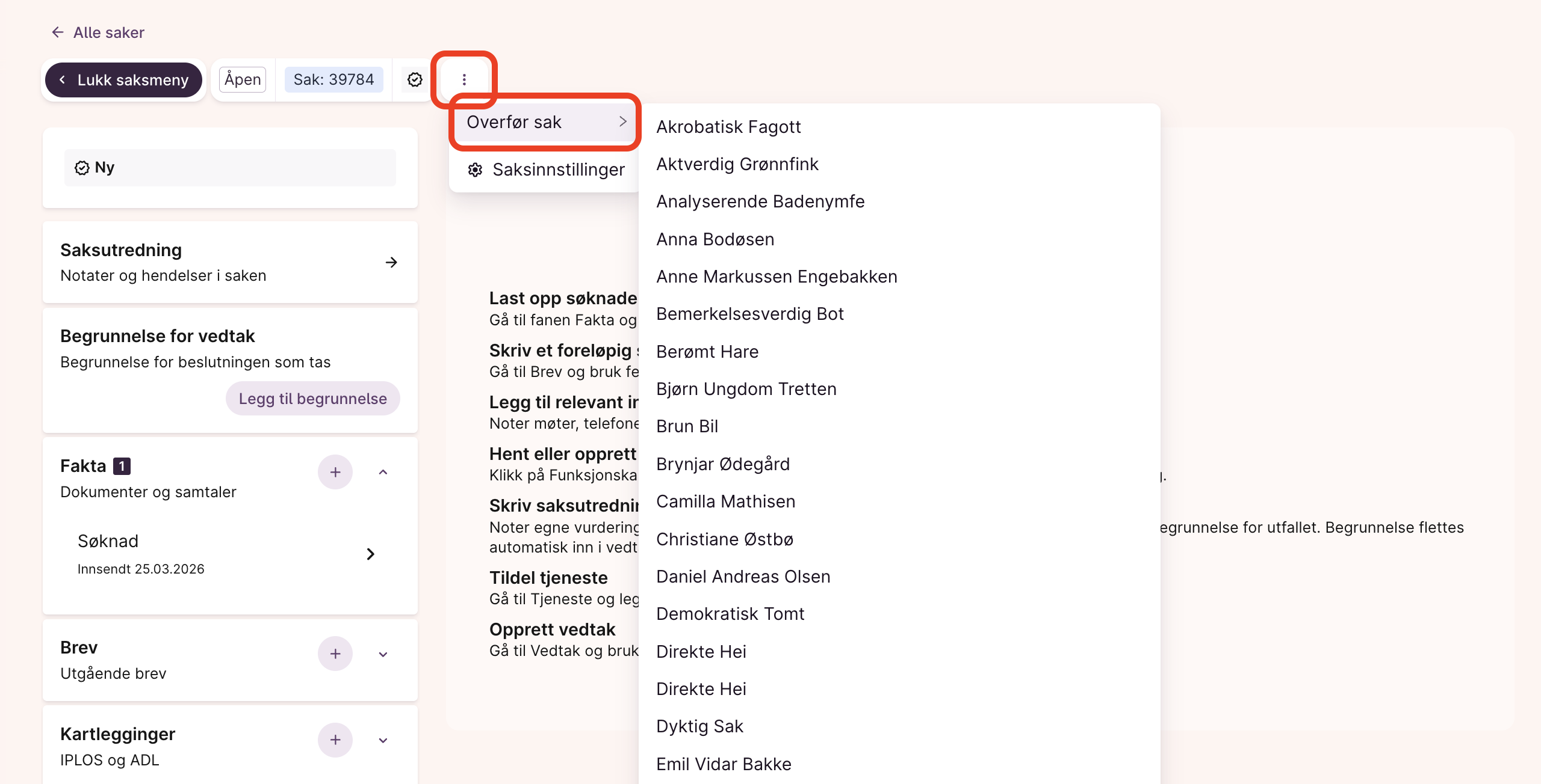 - fra saken: klikk på menyen med tre prikker øverst, og velg Overfør sak.