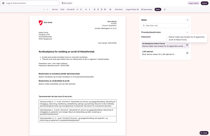 - Flettefelt fylles automatisk med informasjon fra systemet, som pasientens navn eller tjenestested.
