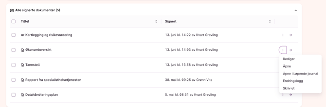 - Når et dokument er signert, vises det også i løpende journal med tidspunkt for signering
