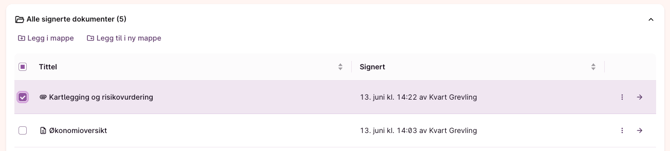 Dokumentene dine er orgaisert i ulike mapper, så du raskt finner det du leter etter. I mappen «alle signerte dokumenter» samles alle opprettede og opplastede filer i én liste. Selv om du flytter et dokument til en annen mappe, ligger det fortsatt her til du sletter det.