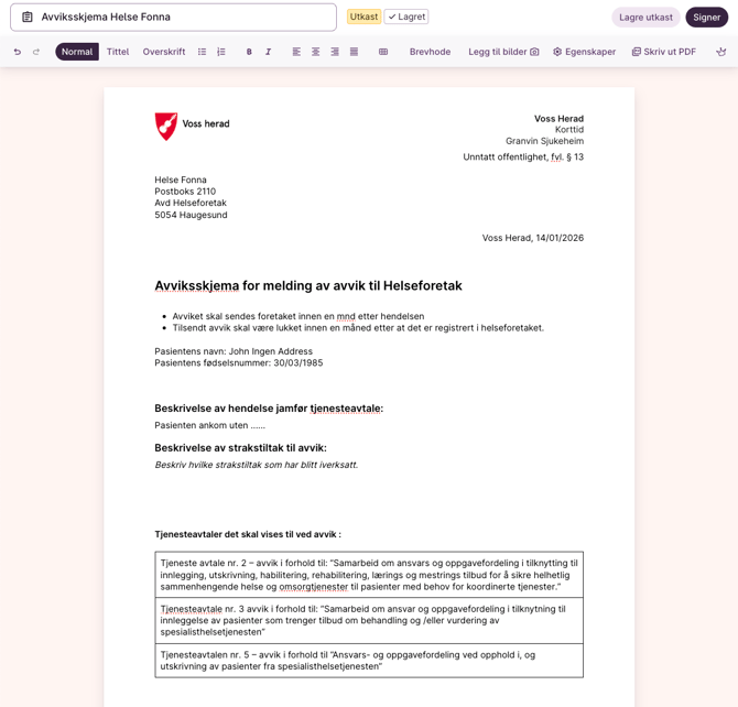 - Brevhode: Trykk på Brevhode for å legge til kommunevåpen og kontaktinformasjon. Du kan redigere innholdet, eller fjerne det med backspace.