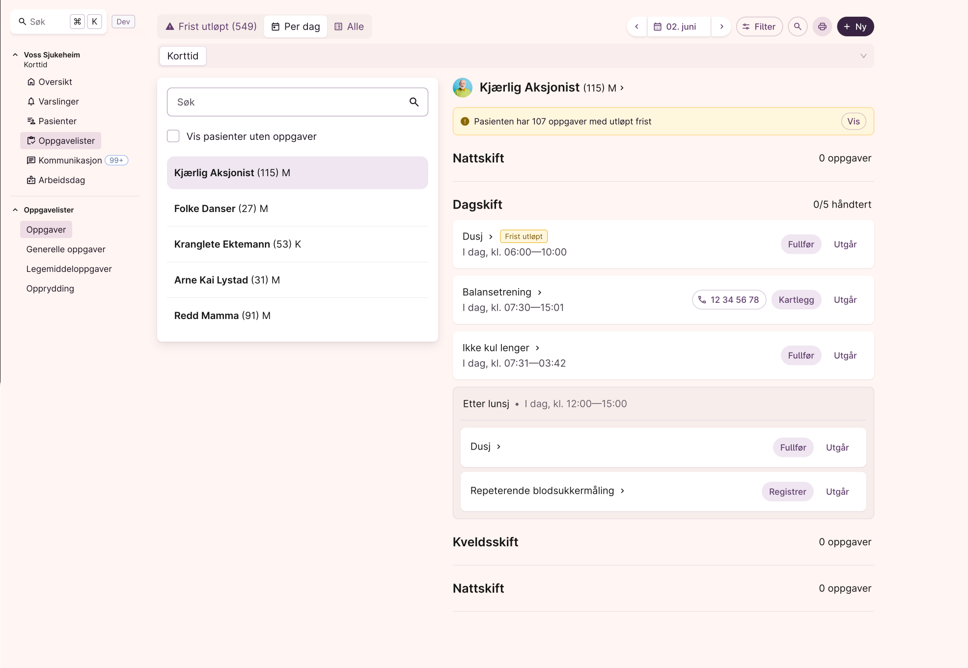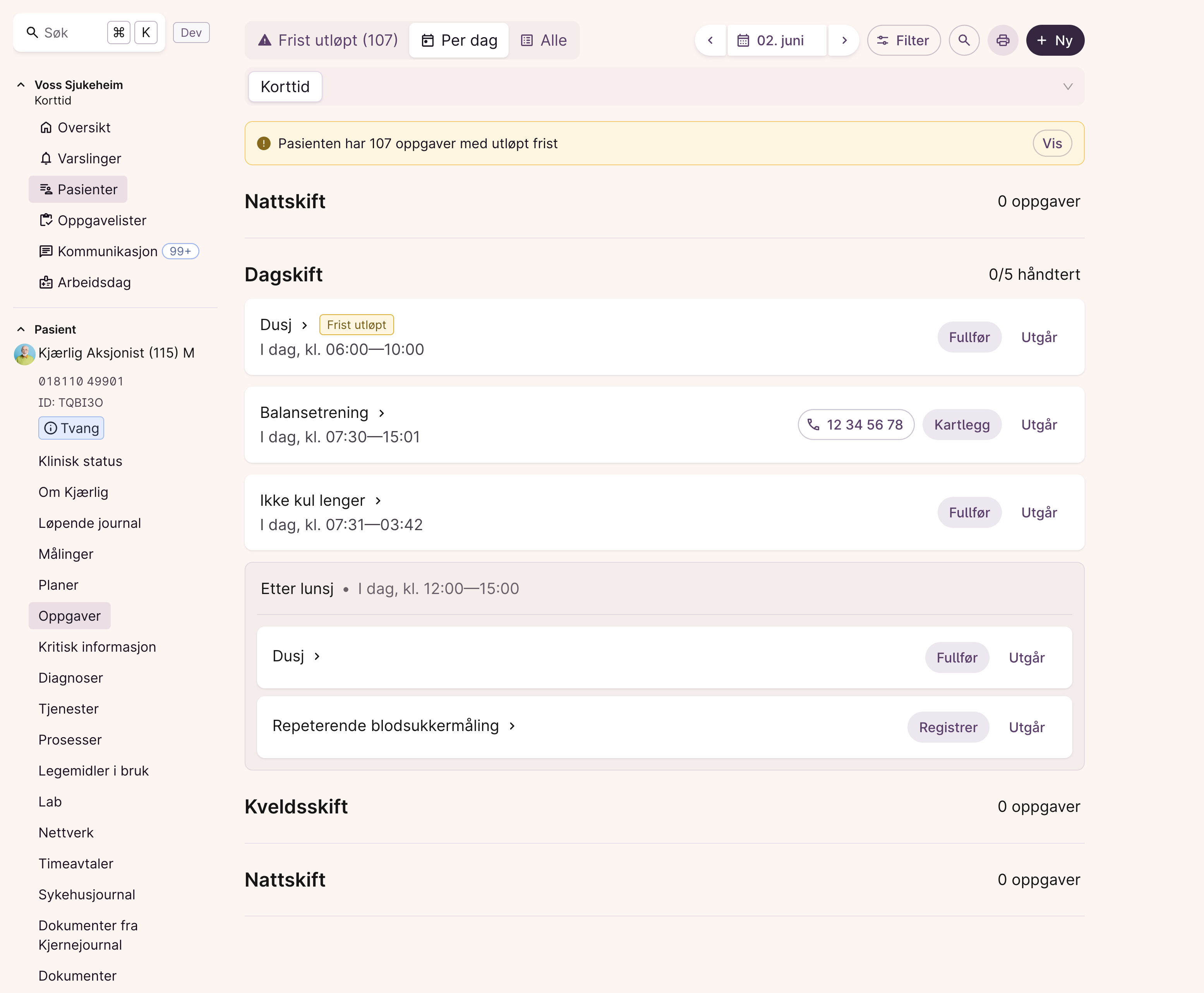 - Under “Frist utløpt” ser dere alle oppgaver som ikke har blitt utført innen fristen. Oppgaver med frist utløpt vises fremdeles på valgt dato i tillegg.