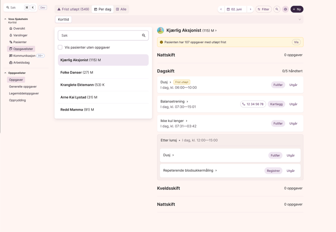 Denne oversikten er bygget opp under samme navigasjon som Oppgavelister for alle pasienter, beskrevet over.