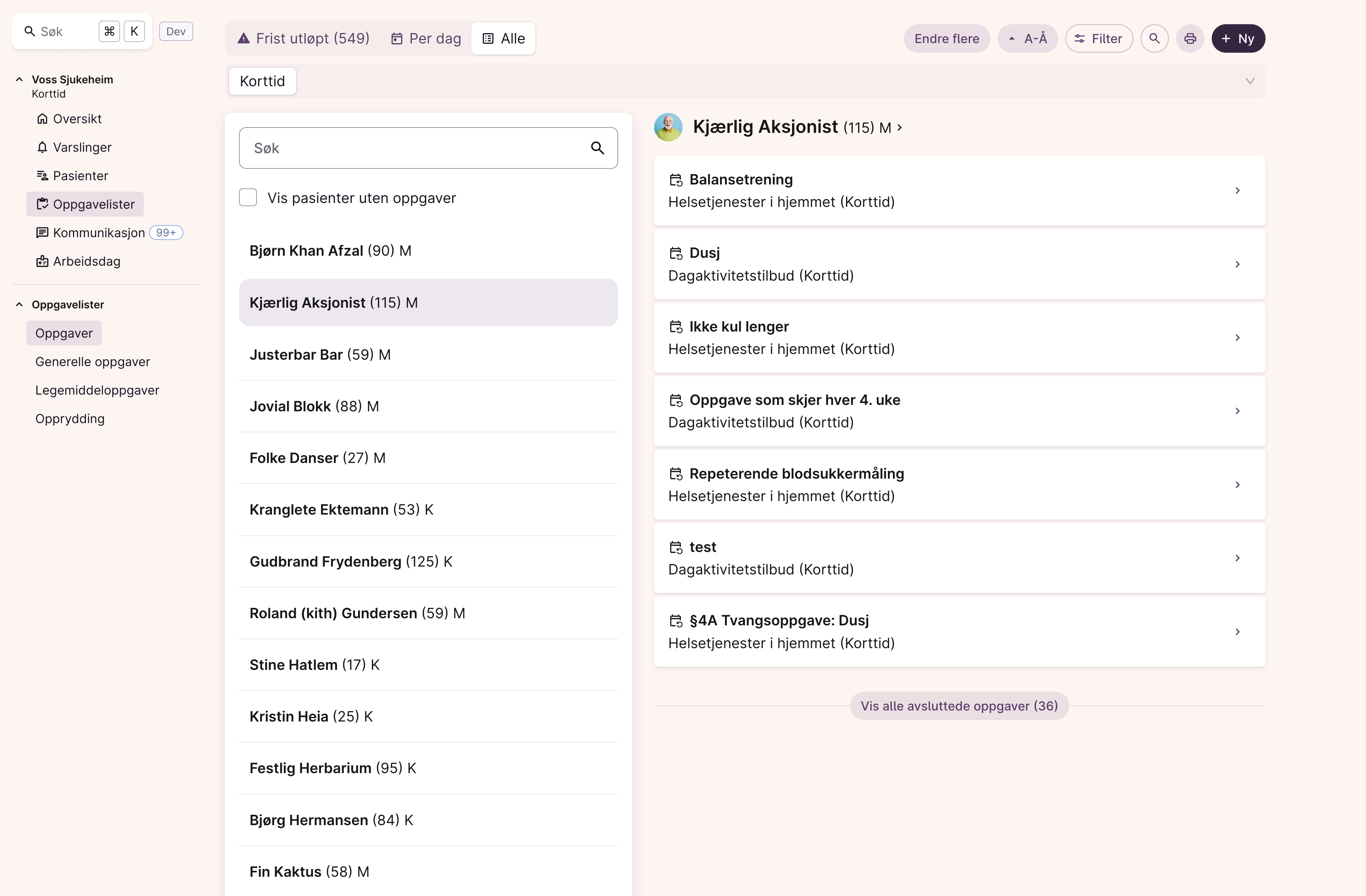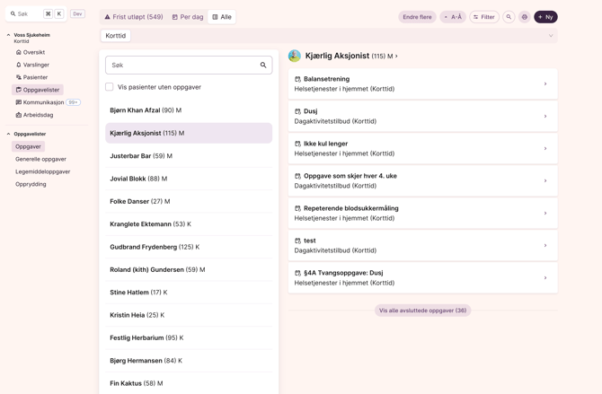 Under “Oppgavelister” og “Oppgaver” kan du se alle pasienters oppgaver.
