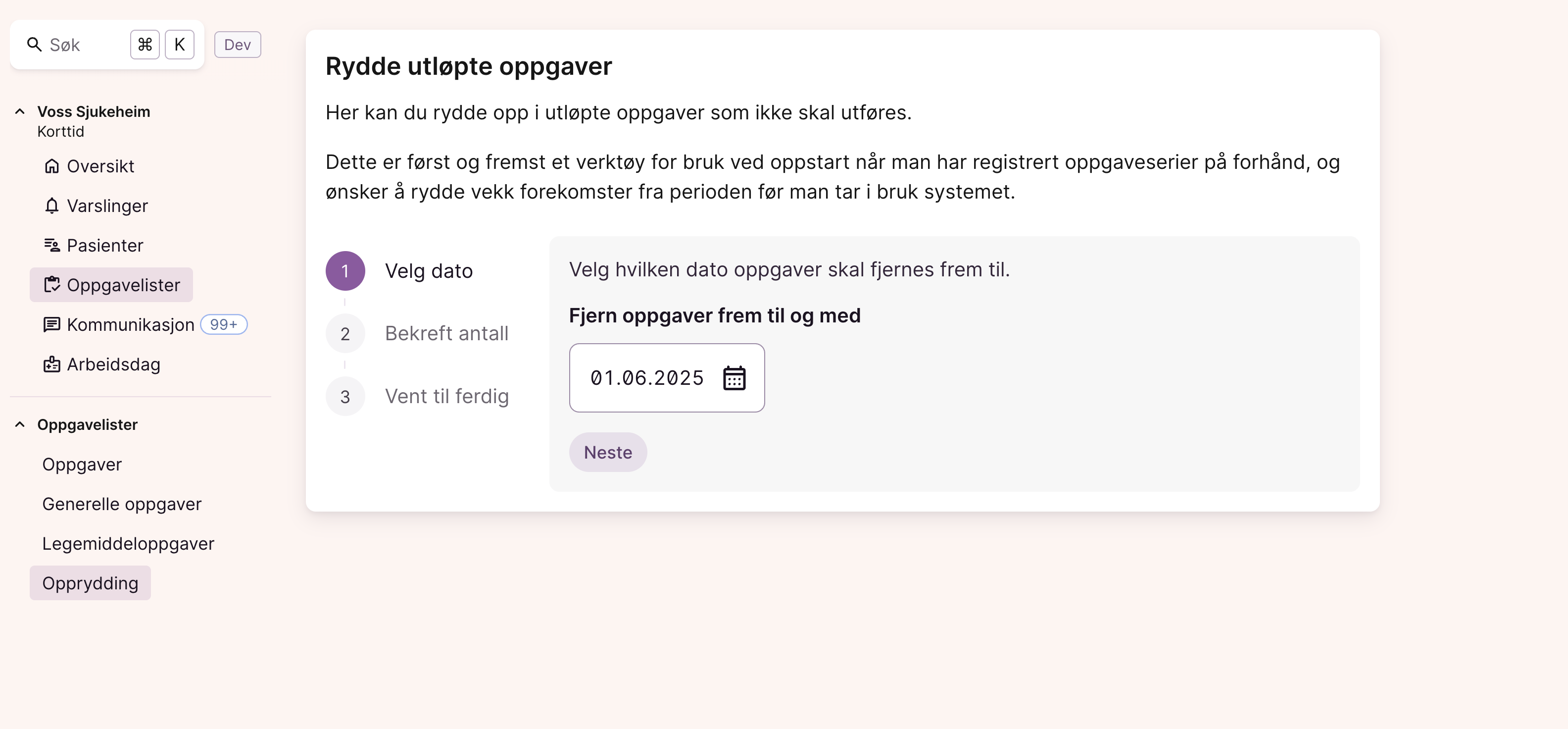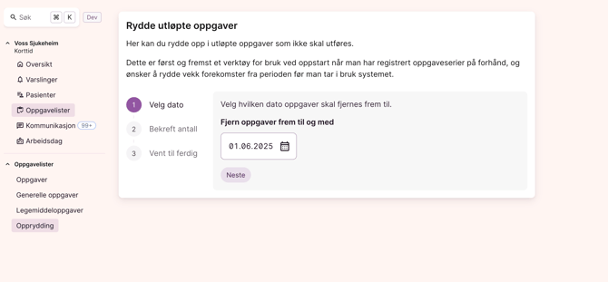 Det kan hope seg opp med oppgaver som har frist utløpt, og noen roller har tilgang til å rydde i disse. Gå til “Oppgavelister”, og velg “Opprydding” i menyen til venstre.