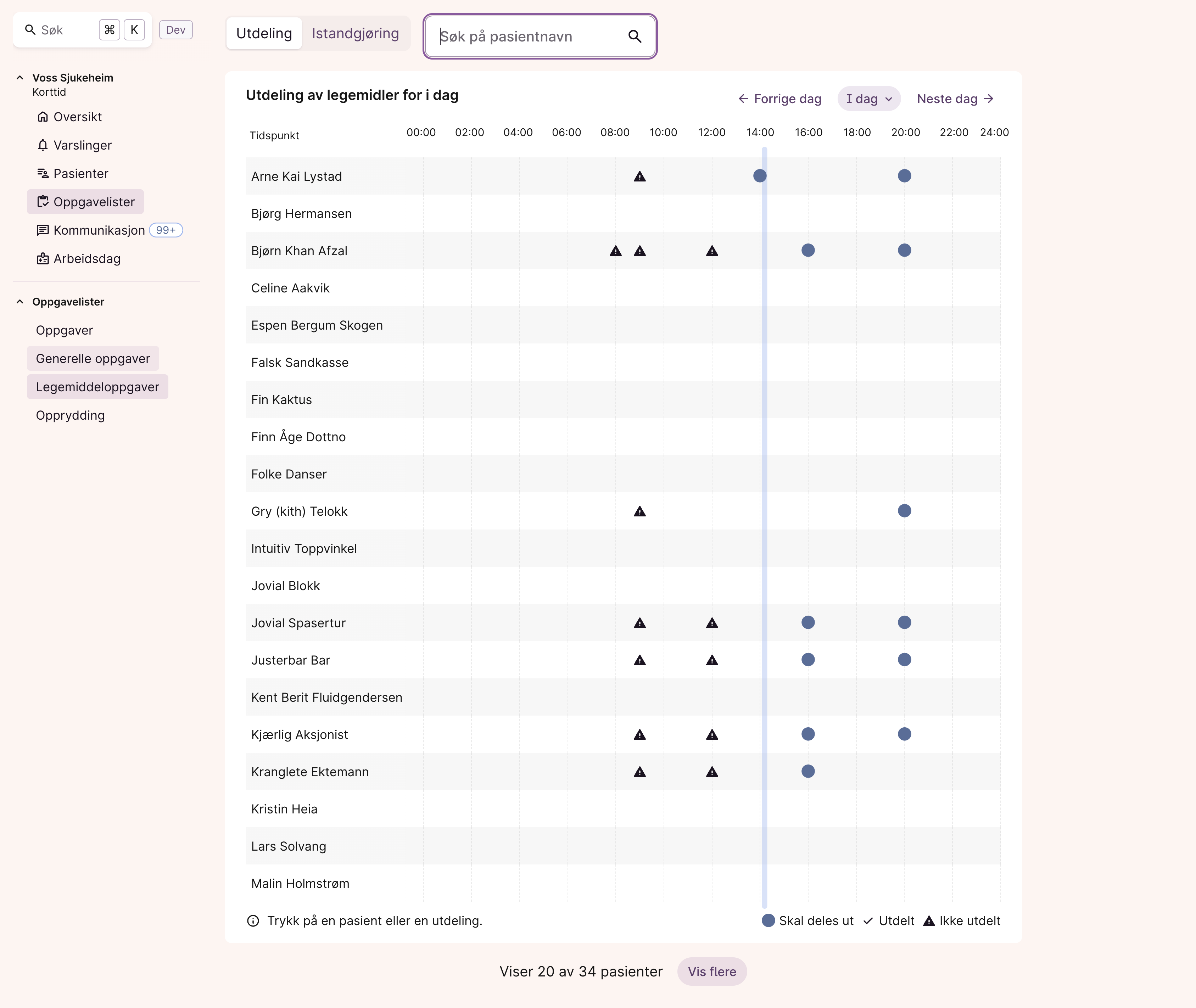 Under “Legemiddeloppgaver” i venstremenyen vil dere få oversikt over alle pasienter med legemidler og tidspunkt for utdeling. Gå til “Istandgjøring” i visningsvalget for å gjøre istand medisiner. Se denne artikkelen for mer detaljer om istandgjøring.