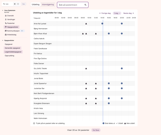 Under “Legemiddeloppgaver” i venstremenyen får du oversikt over alle pasienter med legemidler og tidspunkt for utdeling. Gå til “Istandgjøring” i visningsvalget for å gjøre i stand medisiner. Se denne hjelpeartikkelen for mer detaljer om istandgjøring.