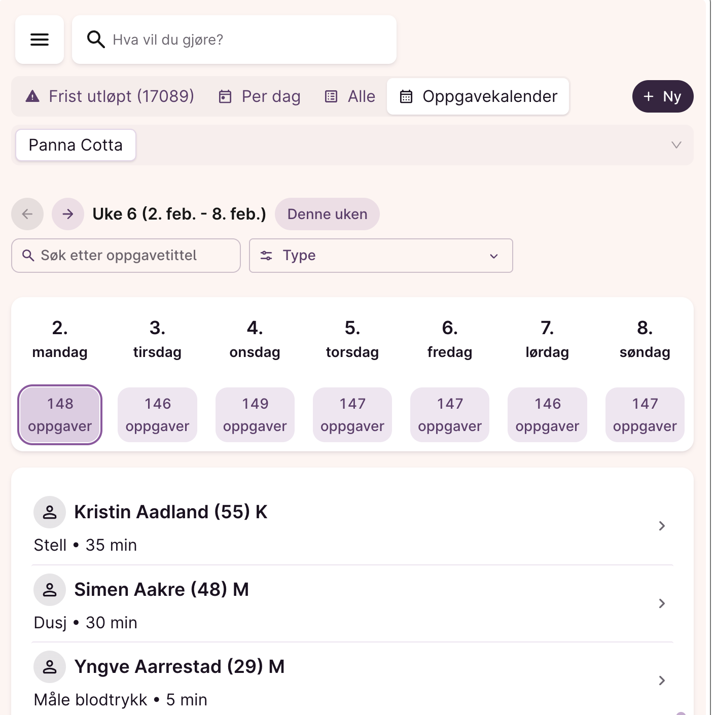 Under “Oppgavekalender” får man en enkel oversikt over alle pasientoppgaver per dag. Her kan man filtrere etter oppgaver, f.eks Dusj eller Krevende oppgaver, eller søke etter fritekst tittel. Trykker man inn på en dag, ser man hvilke pasienter som har hvilke oppgaver.