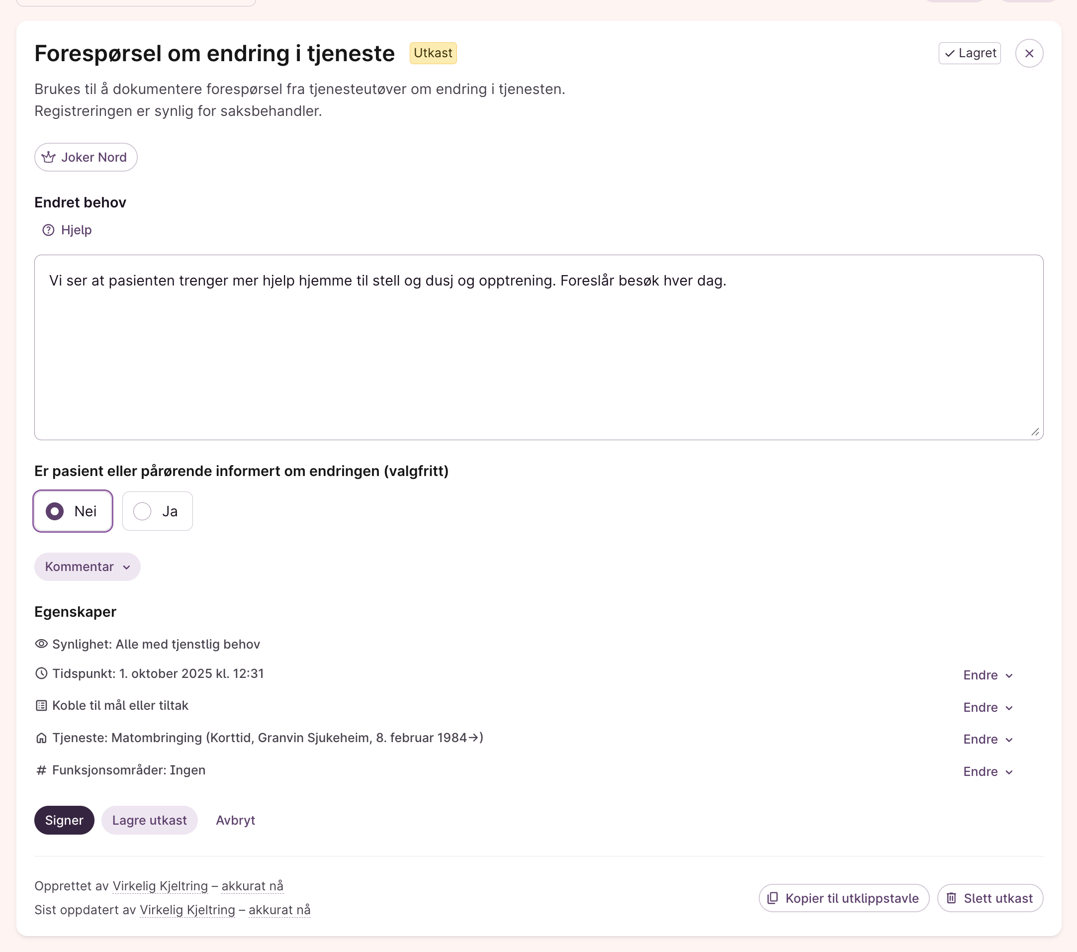 Du kan bruke Forespørsel om endring i tjeneste når du som helsearbeider ser at pasienten har behov for mer eller mindre hjelp enn det som er besluttet. Forespørselen går til saksbehandler, som vurderer om tjenesten skal endres.