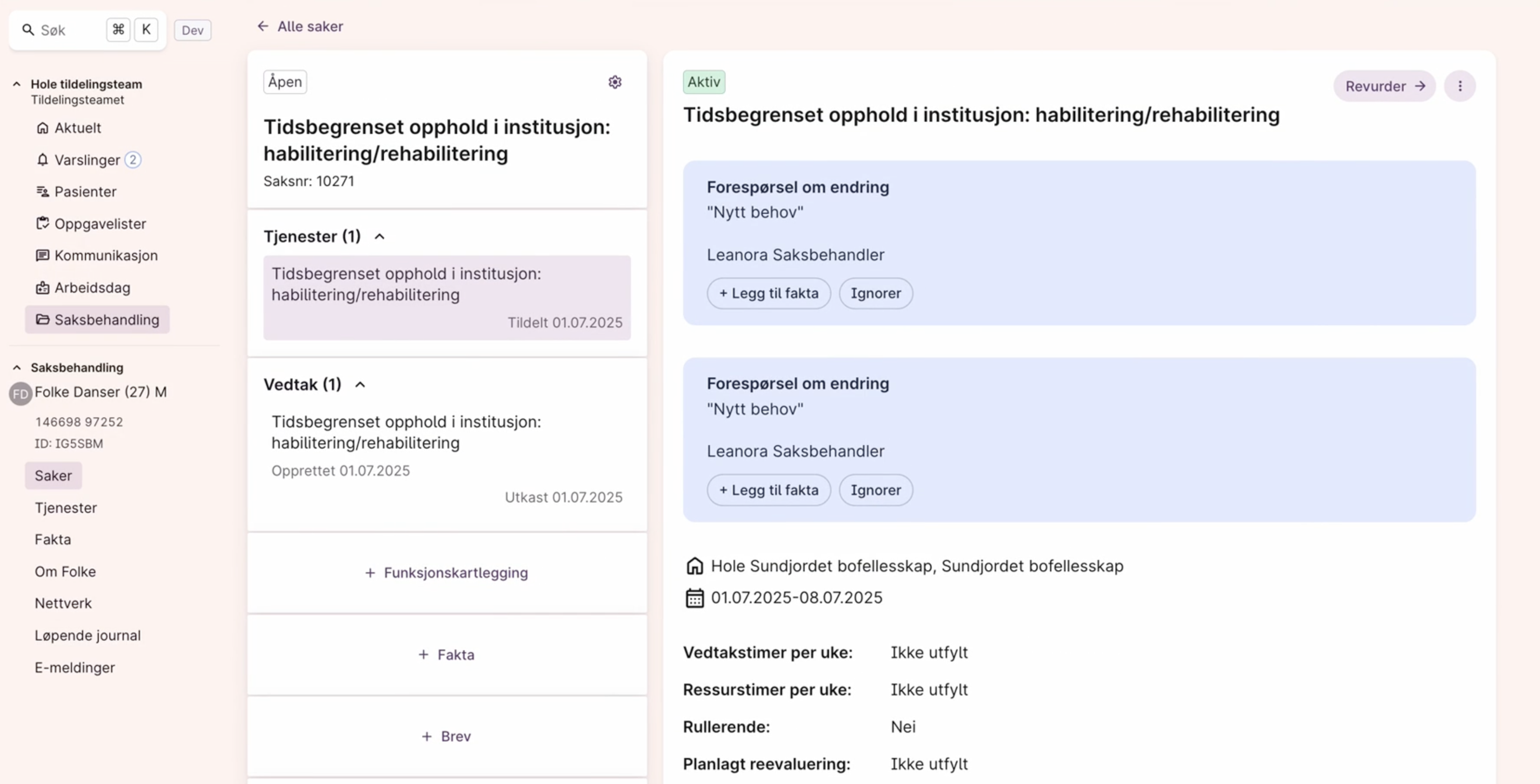 Saksbehandler mottar forespørselen direkte i saken og vurderer om tjenesten skal oppdateres.