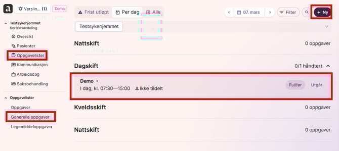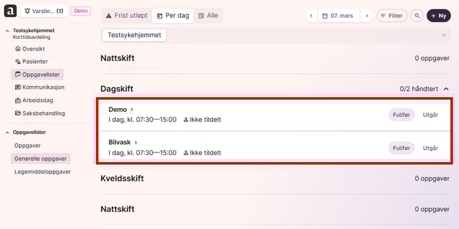Generelle oppgaver er oppgaver som ikke tilhører spesifikke pasienter. De kan være en del av daglige rutiner, vedlikeholdsoppgaver eller andre nødvendige oppgaver som må gjennomføres i avdelingen.