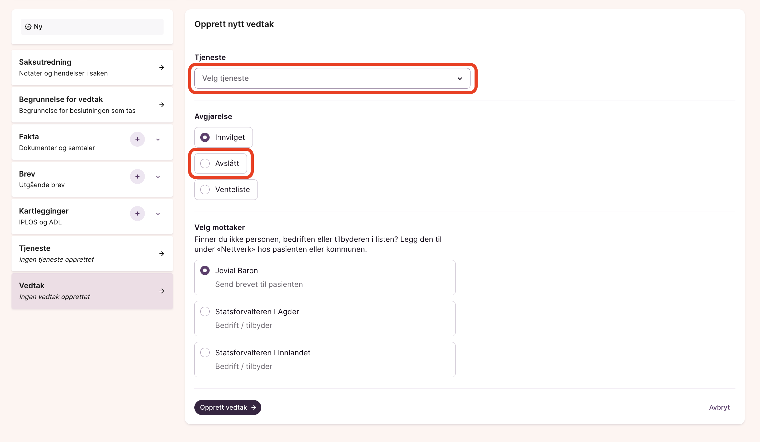 - Opprett vedtaket og velg riktig mal for avslag.