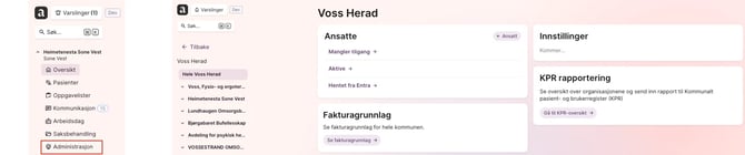 - Naviger til fakturagrunnlag via menypunktet administrasjon. På denne siden vil du finne en boks med tittel Fakturagrunnlag. Trykk deg inn her. I sidemenyen under administrasjon, kan du navigere til det høyeste nivået du har tilgang til. Dette kan være hele kommunen.
