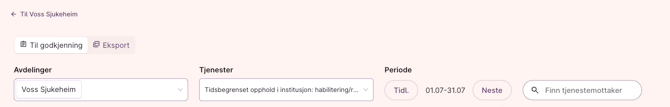 - Velg relevant avdeling, tjeneste og periode. I nedtrekksmenyene velger du de avdelingene (her kan du velge flere) du skal hente fakturagrunnlag for og hvilke tjenester det gjelder. Sjekk at du ser på riktig fakturaperiode. Skal du finne fakturagrunnlaget til én spesifikk tjenestemottaker, kan du søke etter navn i søkefeltet til høyre.