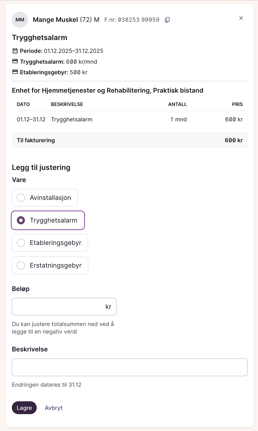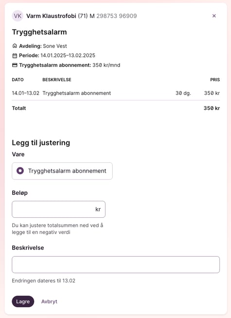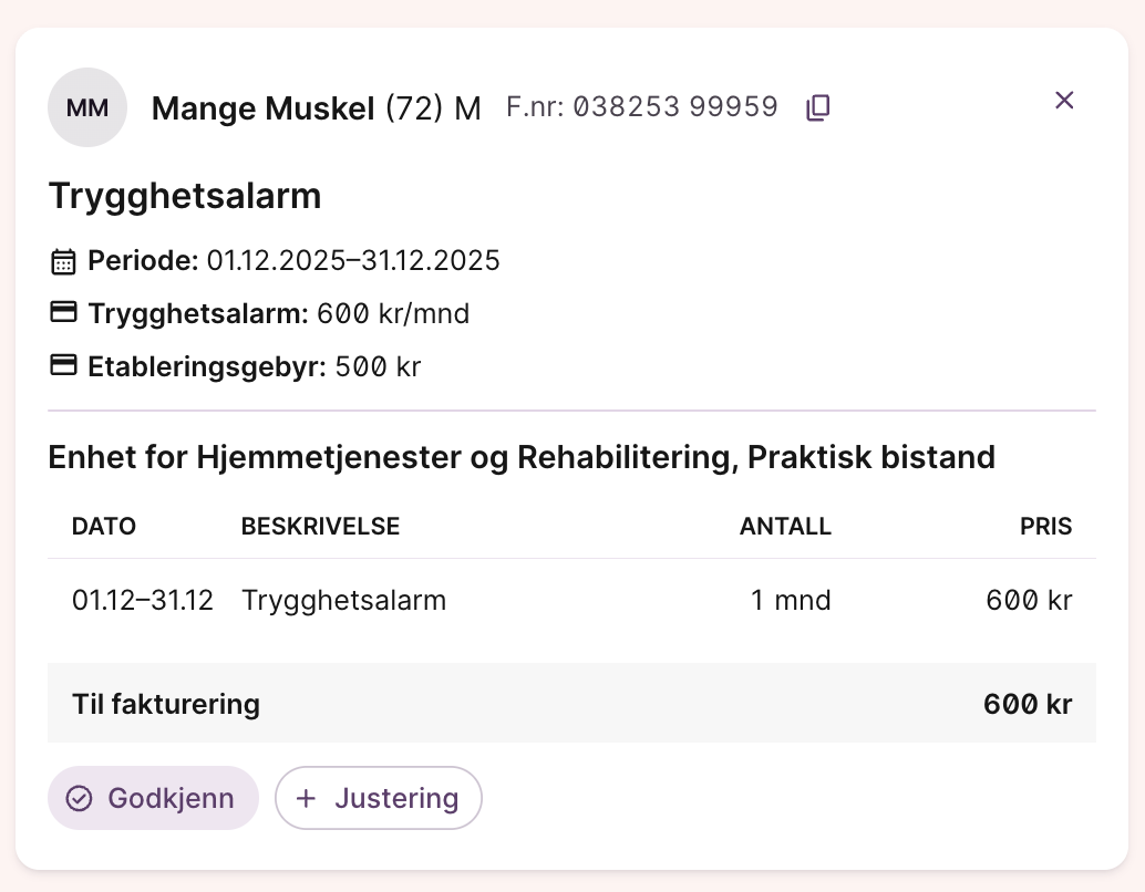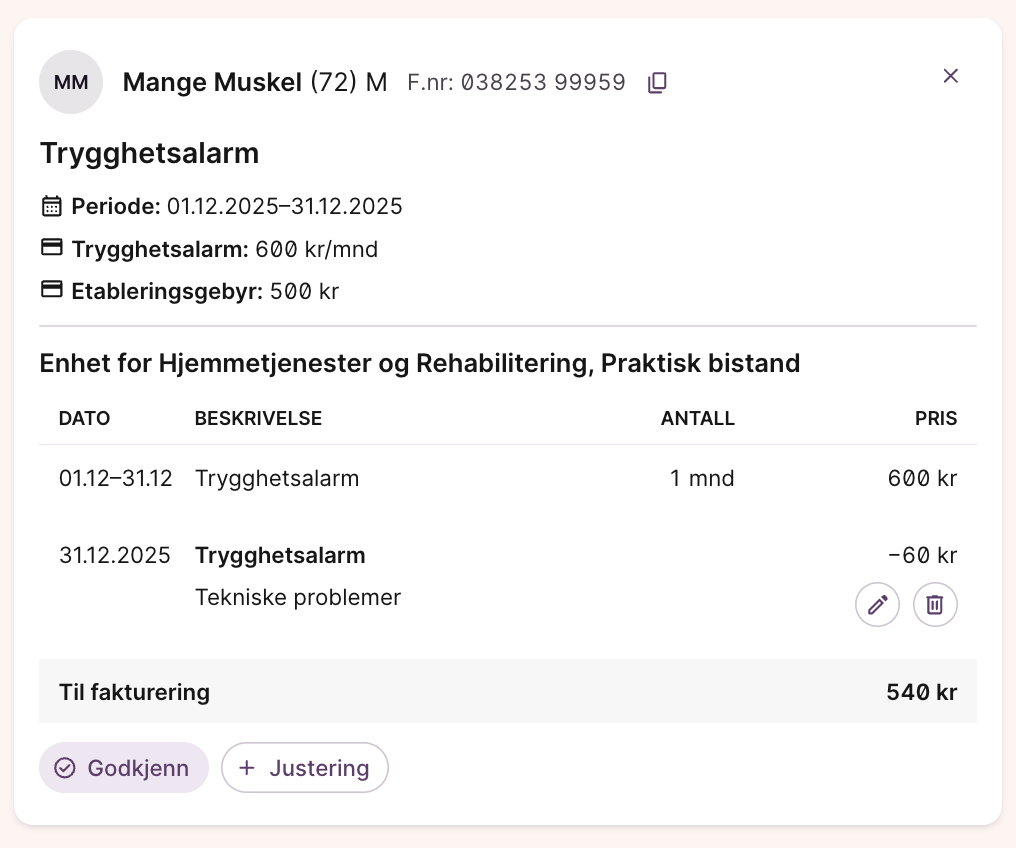 - Klikk deg inn på enkeltgrunnlag og gjør justeringer ved behov. Her vil du da få en oversikt over hvilke priser som er i bruk, hvordan tjenesten er registrert og talt i systemet, og hva totalprisen er. Dersom totalbeløpet skal justeres opp eller ned, kan du legge til en justering. Husk å velge hvilken “vare” som skal justeres, slik at justeringen får et varenummer når det eksporteres til økonomisystemet.