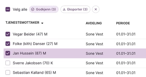 Dersom du ønsker å godkjenne flere, men ikke alle, velger du ‘velg flere’ og haker av de du ønsker å godkjenne. Trykk så ‘Godkjenn (antall)’.