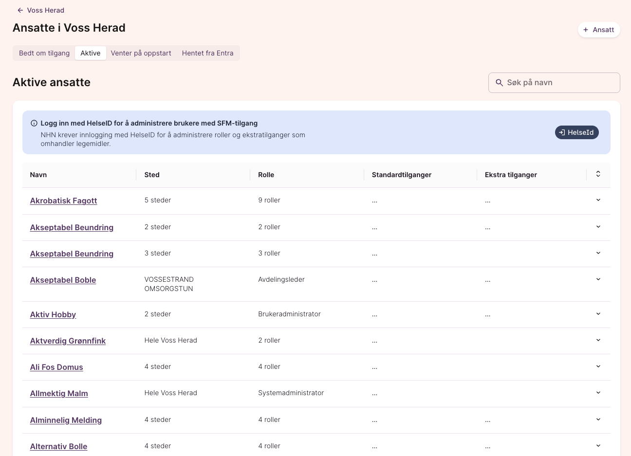 Steg 4: Etter vellykket autentisering med HelseID vil du kunne redigere alle roller og tilganger, inkludert de som er knyttet til SFM.
