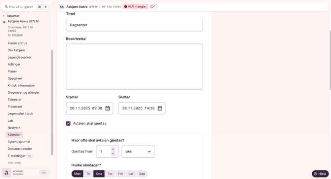 Eksempel: Dagsenter registreres som en fast, gjentakende avtale under pasientens kalender. Start- og sluttid settes til hente- og leveringstid. Har pasienten ulike tider på ulike dager, legges det inn separate avtaler. Det kan være lurt at dagsenteret selv legger inn avtalene, da de har oversikt over aktuelle dager. Se artikkelen om kalender for mer informasjon om hvordan å opprette avtaler.