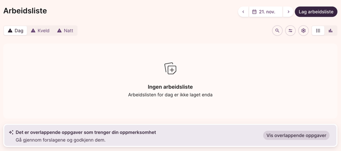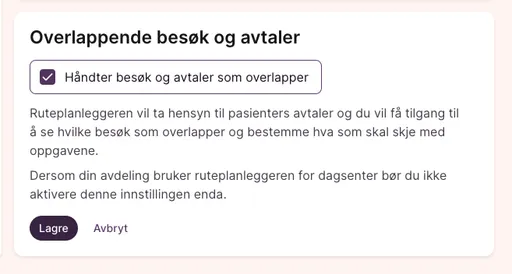 Under planlegging av arbeidslister får du opp varsel dersom det er overlappende oppgaver og avtaler som kan håndteres. Du kan gå inn og se over hva som overlapper. Dersom du ikke foretar deg noe, vil ruteplanleggeren lage lister uavhengig av avtalene.