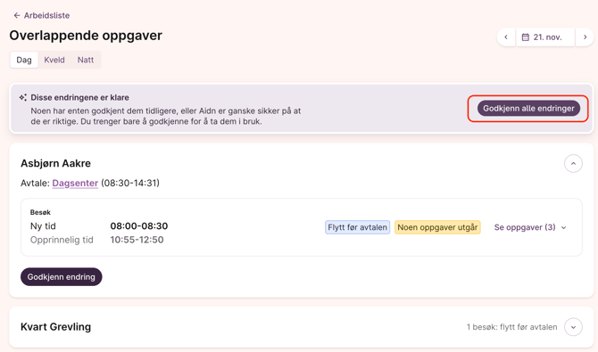 Neste gang den samme overlappingen oppstår, vil Aidn foreslå de samme endringene du godtok ved forrige anledning. Alle tidligere godkjente endringer finner du nederst, under “Disse endringene er klare” Da trenger du bare å se over og trykke “Godkjenn alle endringer”.