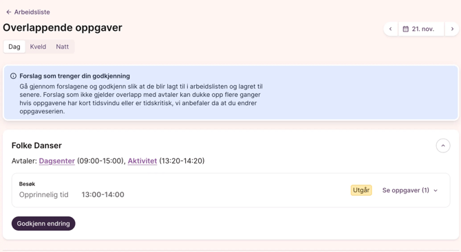 Aidn vurderer hva slags oppgave det er, når den overlapper, og hva som er mulig å gjøre. Slik foreslår vi nye tidspunkt (eksempel med dagsenter)