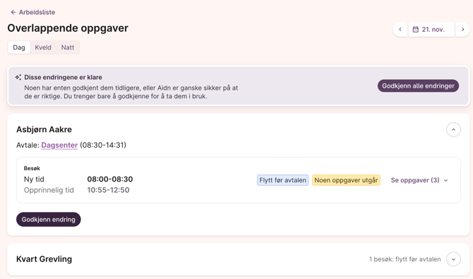 Merk: Dersom endringene har blitt godkjent for en tidligere dag, vil ikke Aidn automatisk endre tilbake igjen. Dersom du ønsker å flytte oppgavene tilbake til opprinnelig tid, kan du finne pasienten i listen og endre tilbake.