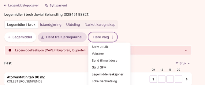 I Aidn kan du åpne SFM direkte fra pasientens side via flere valg menyen (tre prikker) i «Legemidler i bruk».