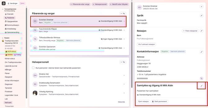 Under Nettverk kan du se en oversikt over tilgangene til pårørende ved å gå inn i redigeringsmodus.