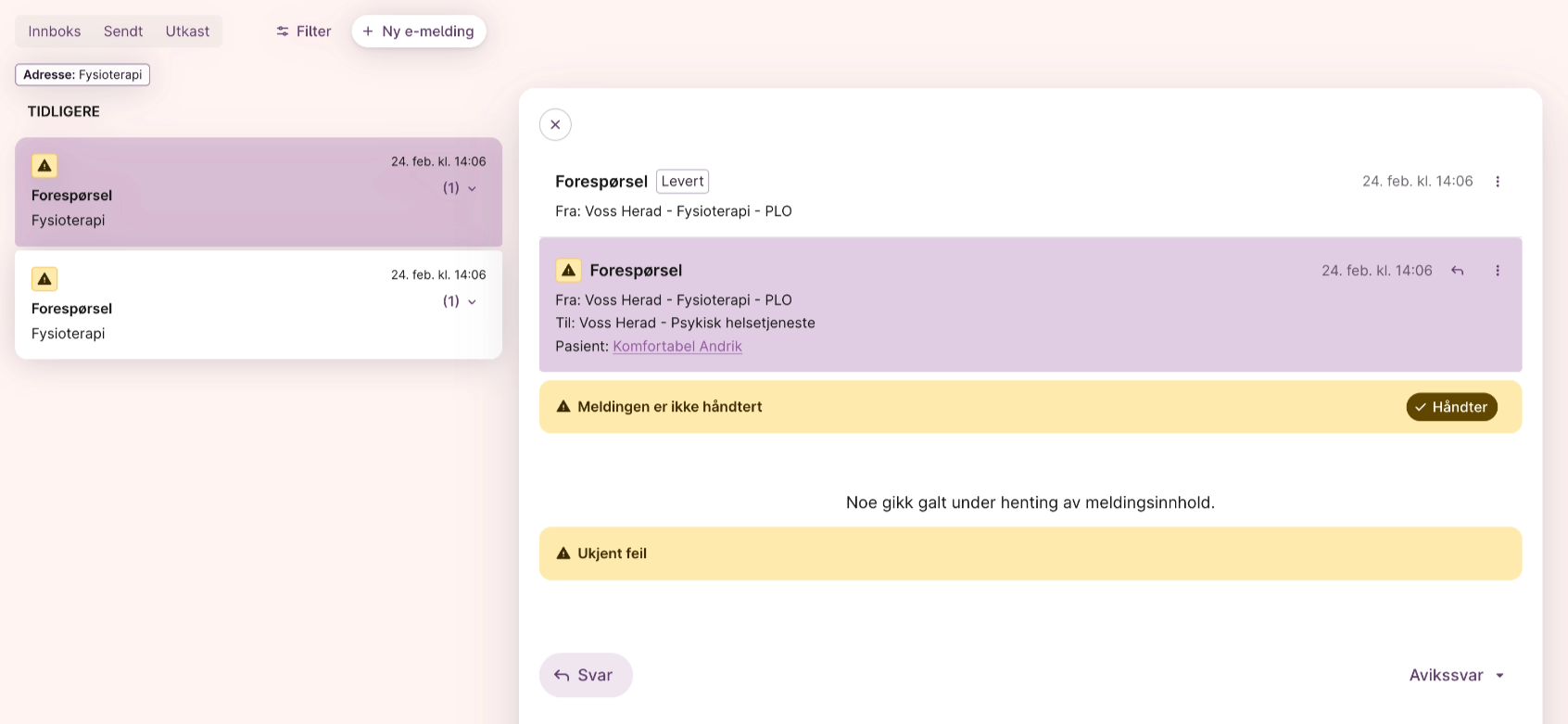 Den vanligste årsaken til denne feilmeldingen er at e-meldingen er sendt til eller fra adressen Psykisk helsetjeneste internt i kommunen.