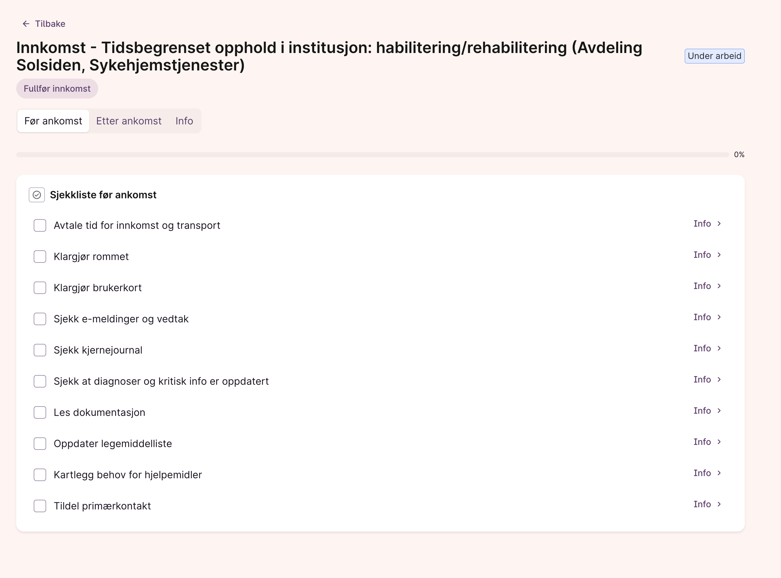 - Etter ankomst – oppgaver som følges opp når pasienten har kommet