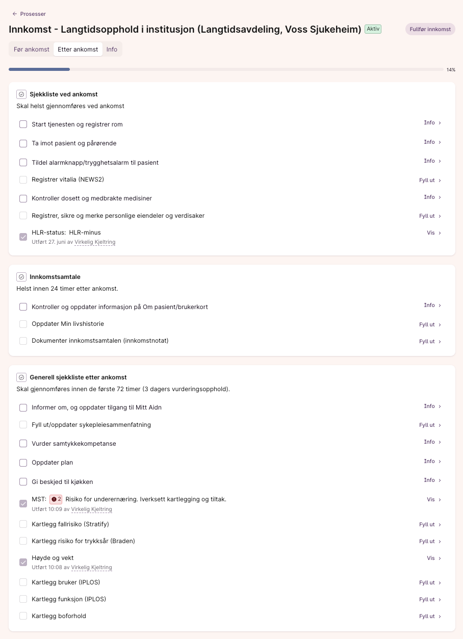 - Noen punkter kan utføres direkte i sjekklisten, f.eks. ernæringsrisiko, NEWS, vektregistrering, med mer. Ved disse punktene står det Fyll ut til høyre i stedet for Info.