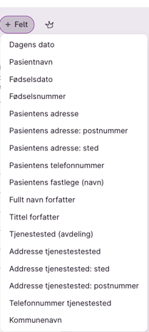 • Felt (flettefelt) Sett inn en placeholder for informasjon som er spesifikk for pasient, forfatter eller tjenestested ved å trykke på Felt. Disse feltene fylles automatisk når dokumentet opprettes. Du kan bruke felt som: