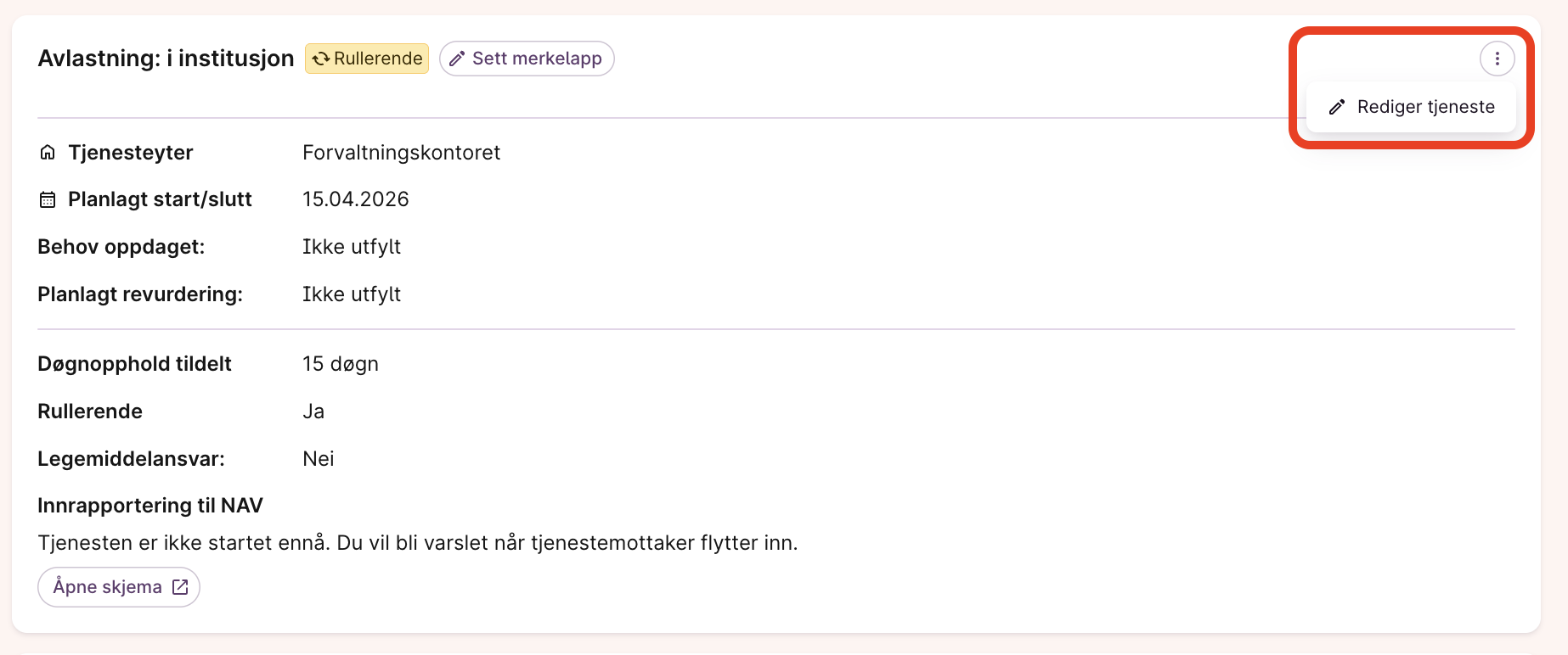 Merk: Dersom vedtaket er ferdigstilt, bør du vurdere om endringene vil være i strid med det som er vedtatt. Hvis det er tilfelle, bør tjenesten revurderes og det bør fattes et nytt vedtak.