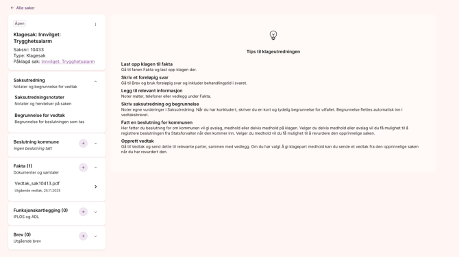 - Når du klikker på åpne klagesak vil en ny klagesak opprettes og i toppen finner du en lenke tilbake til den påklagde saken. Fra den påklagde saken vil du også kunne se klagesaken ligge i “sakshistorikken”.