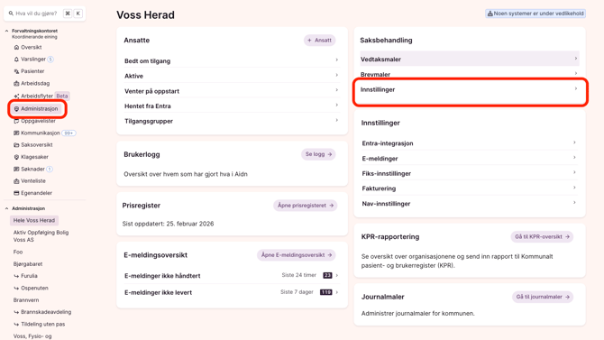 Klikk på “Administrasjon” i venstremenyen og velg “Innstillinger” under saksbehandling. Dersom du ikke ser “Administrasjon” i din meny mangler du tilgang og må be om dette.