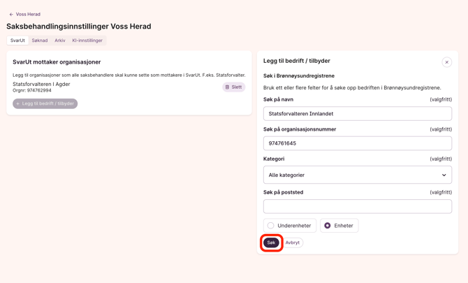 Fyll inn informasjon om organisasjonen du ønsker å legge til og trykk på “søk”.