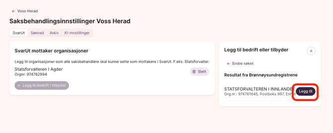 Trykk på “Legg til” for å legge bedrift/tilbyder inn i nettverket.