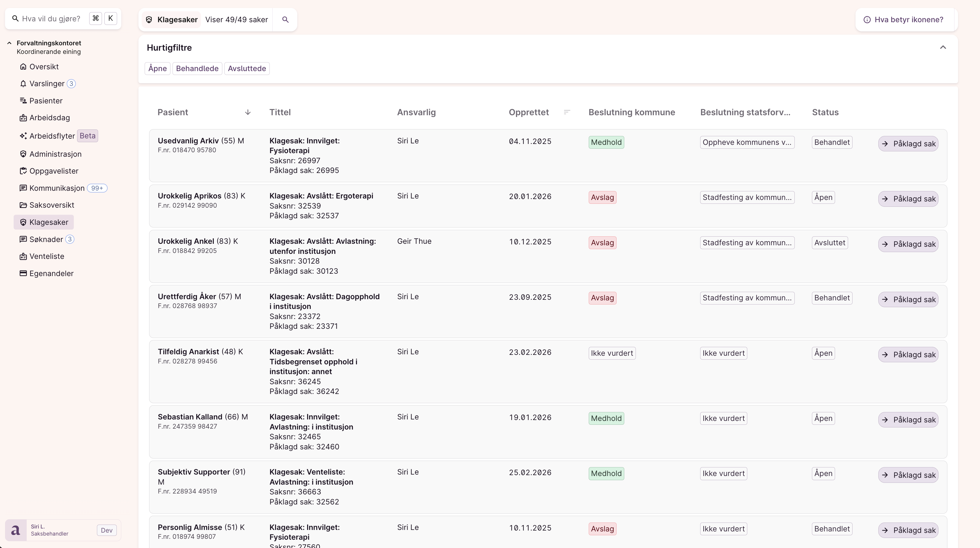 I venstremenyen finner du en oversikt over alle klagesaker, i oversiktsbildet finner du: